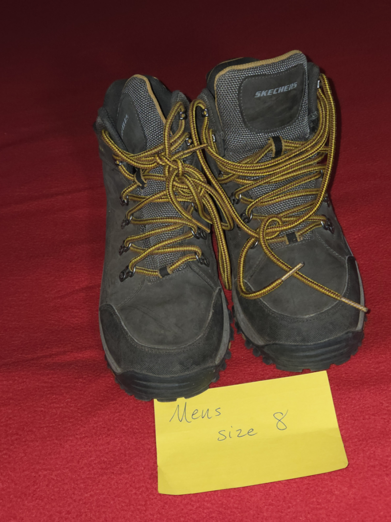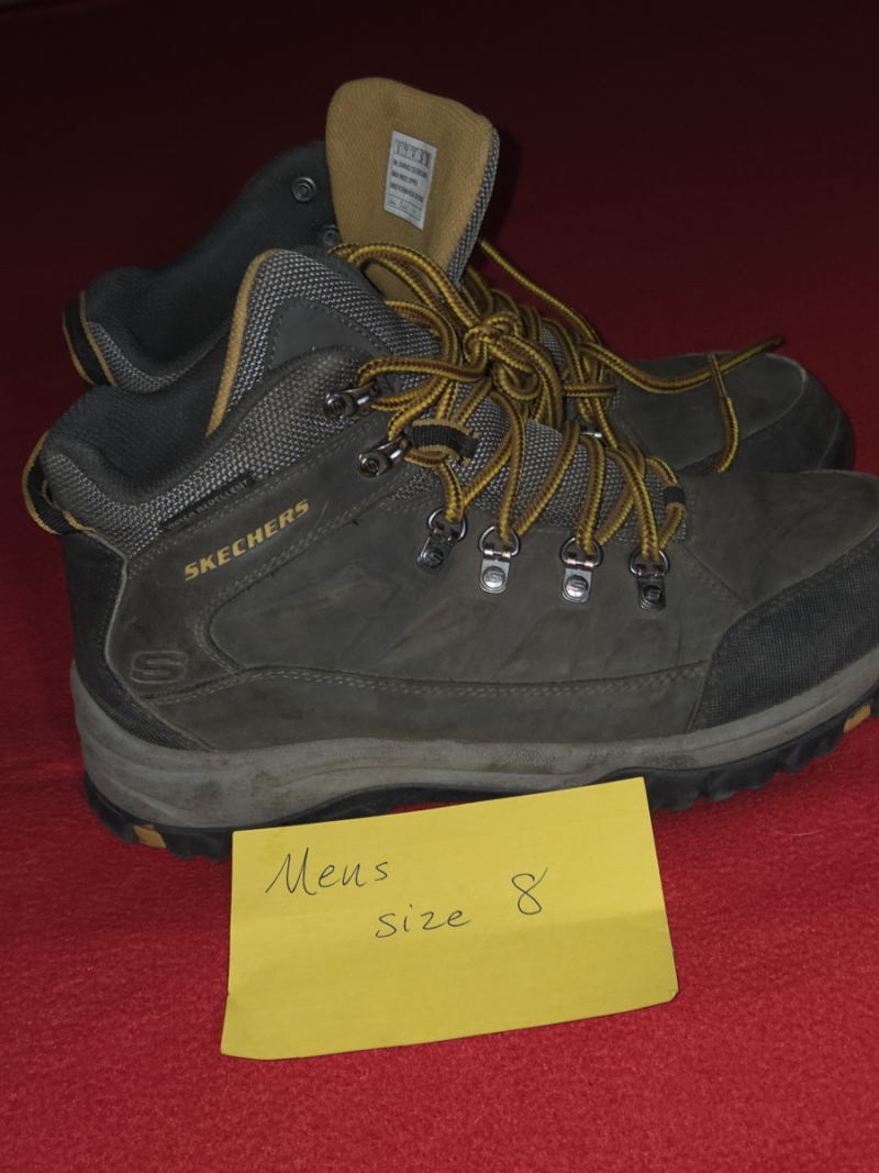 Boots 1 are a set of Skechers, likely never worn. Size 8 Adult.